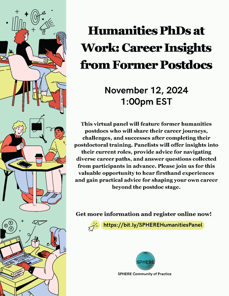 The SPHERE Humanities Group focuses on developing and identifying resources to support postdoctoral scholars in the humanities. Learn our current and past projects and meet our members.